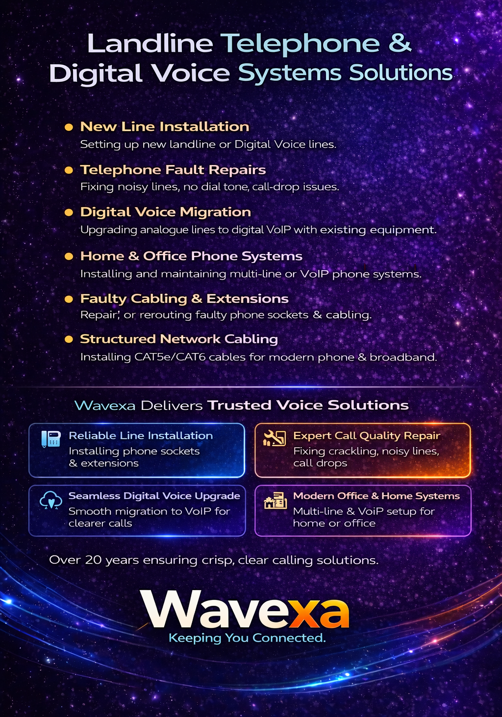 You may already be among the hundreds of thousands of individuals who have successfully transitioned to a digital voice telephone system, adapting to a more modern method of communication that replaces traditional analogue lines. Alternatively, you could be one of the many who have yet to complete the switch but are expected to do so before the January 2027 deadline, when the existing system is scheduled to be permanently retired. While this nationwide migration promises long-term benefits—such as improved call quality, enhanced features, and a more resilient infrastructure—it is not without its challenges. Many people, particularly older adults or those less familiar with digital technology, may find the transition confusing or overwhelming. Setting up new equipment, understanding how internet-based calling works, or troubleshooting issues can create frustration and uncertainty. There are also practical concerns. Unlike traditional landlines, digital voice systems often rely on an internet connection and mains electricity, meaning that power outages or broadband disruptions can affect service availability. This has raised concerns for vulnerable individuals who depend on reliable phone access, including those using telecare devices, emergency alarms, or medical monitoring systems that may not be immediately compatible with the new technology. In rural or underserved areas, limited broadband reliability can further complicate the transition, making digital voice systems less dependable than the legacy network they replace. In these situations, support from an experienced professional can make a significant difference. A Wavexa expert technician can guide you through every stage of the transition, from assessing your current setup to recommending the most suitable equipment for your needs. They can handle installation, ensure your devices are correctly configured, and check compatibility with any existing telecare or specialist systems. Importantly, they can also provide reassurance by explaining how everything works in clear, simple terms, helping to reduce stress and avoid common pitfalls. With expert assistance, you can feel confident that your digital voice service is set up safely, reliably, and ready for the future. Whether you have already made the switch or are preparing to do so, understanding these potential challenges is essential. With proper support, clear guidance, and adequate preparation, the transition can be managed more smoothly—ensuring that no one is left disconnected as the UK moves toward a fully digital communications network.